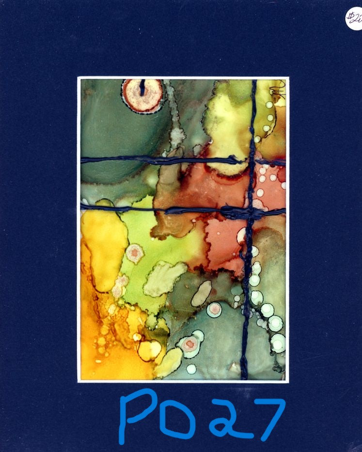 5x7 Alcohol Ink Painting with 8x10 black mat. Primary colors: Orange, green & brass with bubbles & gold accents. Raised black dividing lines. Detailed with bubbles & gold detail. |