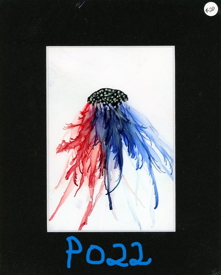 5x7 Alcohol Ink Painting with 8x10 black mat. Primary colors: blues & reds on white. Feathered detail. |
