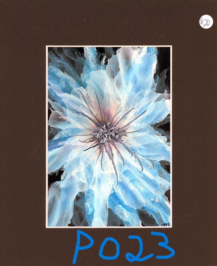5x7 Alcohol Ink Painting with 8x10 black mat. Primary colors: blues & white on black. |